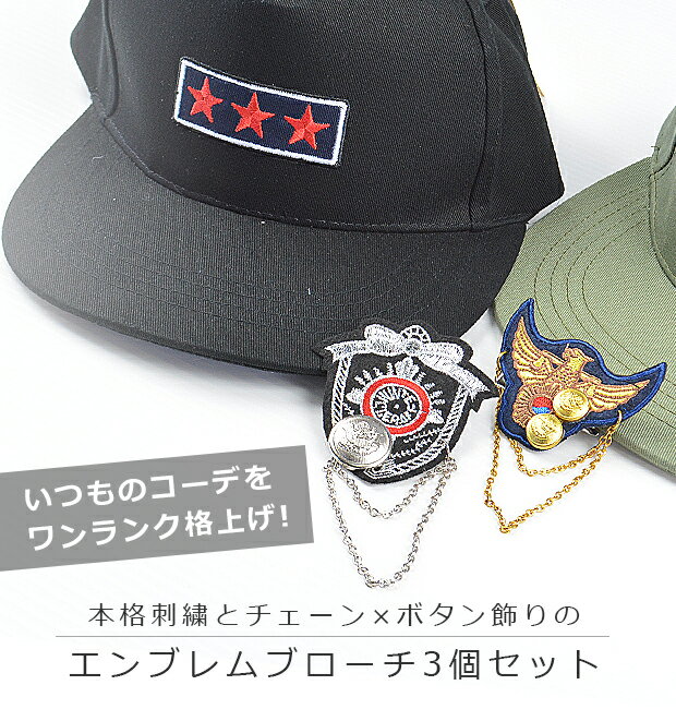 【お買い物マラソン 送料無料】【本格刺繍】エンブレムブローチ★おまかせ3個セット 入学式・卒業式にもピッタリ!☆洋服だけでなく帽子やバッグにも♪いつものコーデを簡単アップデート☆本格刺繍とチェーン・ボタン飾りの格好いいブローチ!5種類の中から